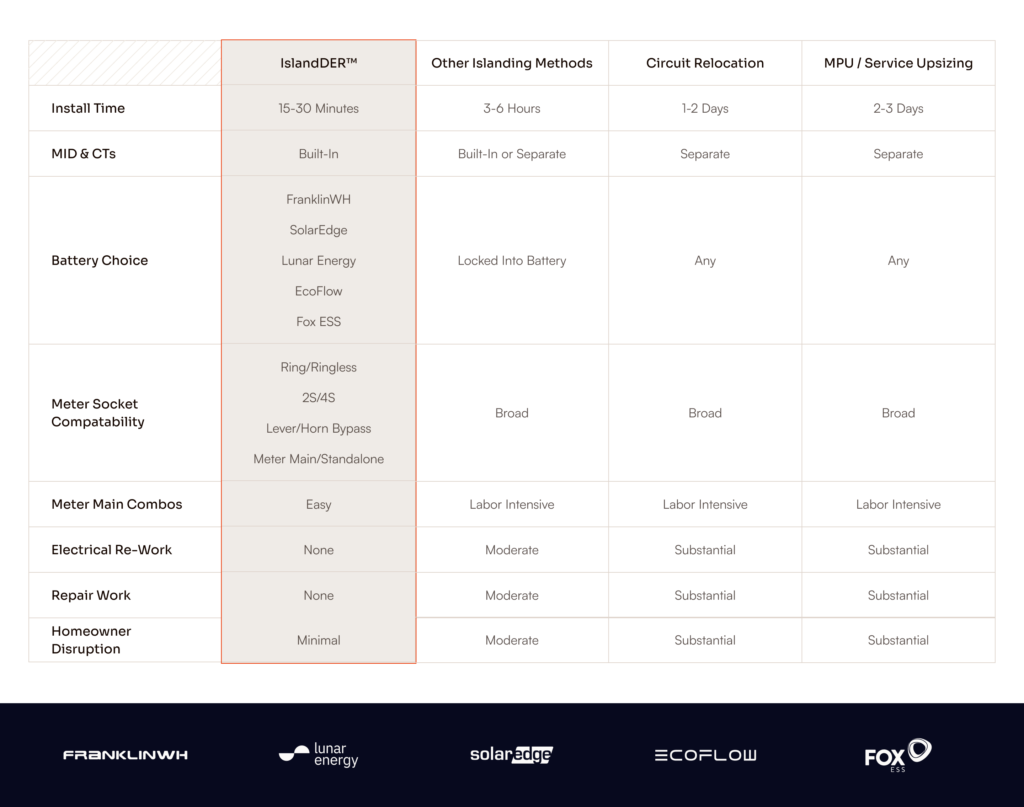 Installers are cutting costs and timelines on solar-plus-battery installs thanks to our IslandDER™ meter collar, which plugs directly into the utility meter socket outside the home. This innovation bypasses the need for main panel upgrades, full service replacements, or circuit relocations—all of which lead to lost revenue and scheduling challenges for installers and increased costs for end customers. By eliminating these hurdles, crews can complete more jobs per week while homeowners save thousands in surprise electrical costs and drywall repairs with less disruption to their daily lives.